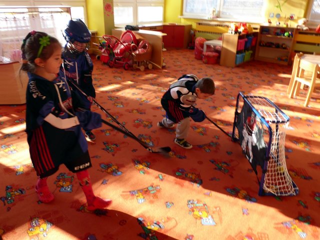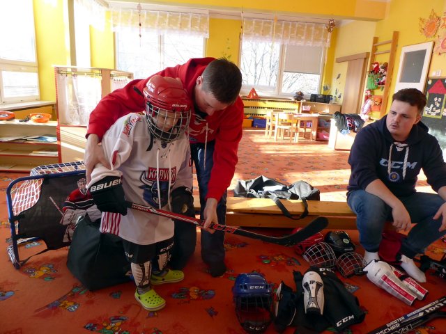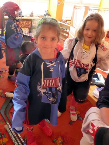 Zavítali k nám karvinští hokejisté. Starším dětem z obou tříd připravili krátké povídání o hokeji, pravidlech hokeje a karvinském dětském týmu.