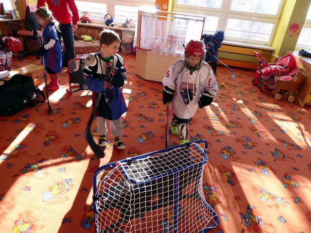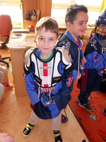 Dětem představili výzbroj i výstroj každého hokejisty a dokonce si někteří mohli hokejový obleček vyzkoušet. Nakonec hokejisté dětem rozdali drobné dárečky s informacemi pro rodiče a pozváním na ledovou plochu. Takže milí rodiče, kdo by měl zájem si zabruslit, budeme na informační tabuli předem informovat o termínu.