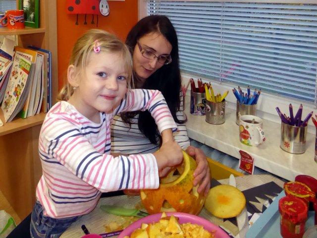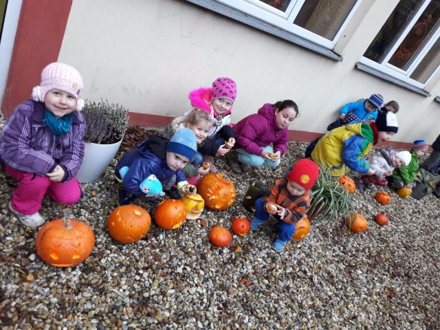 Ve školce se dýňovalo. Rodiče s dětmi si přinesli dýně různých velikostí a na třídách se dlabalo a vyřezávalo. Na závěr jsme dýně vynesli před budovu naší školičky a zazpívali písničky.