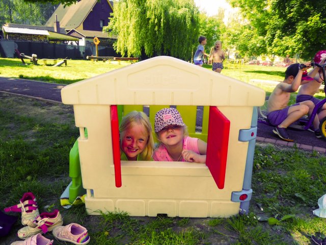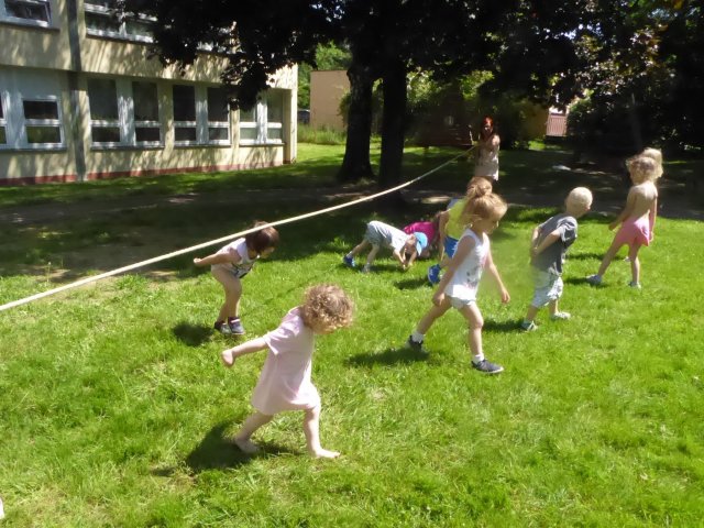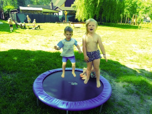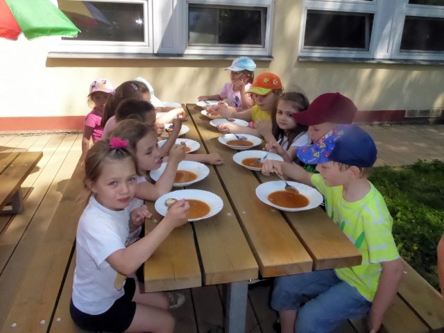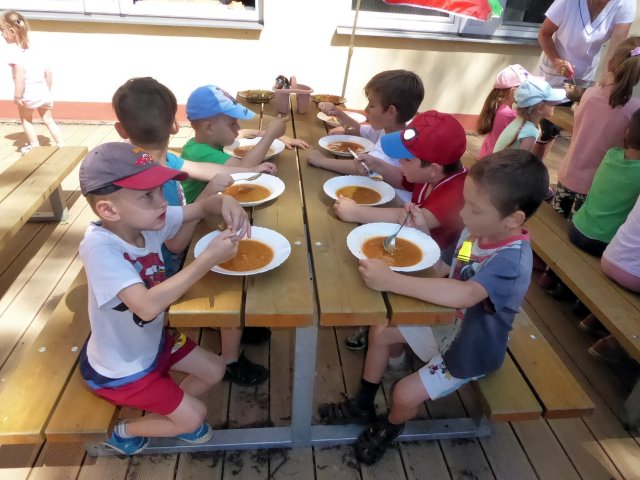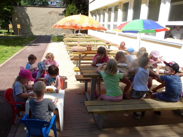 Krásné počasí nás nabádá ke hrám na zahradě. Děti se čvachtají, opalují, skáčou na trampolíně, cvičí a když vyhládne, tak i obědvají. A že jim venku fakt chutná.