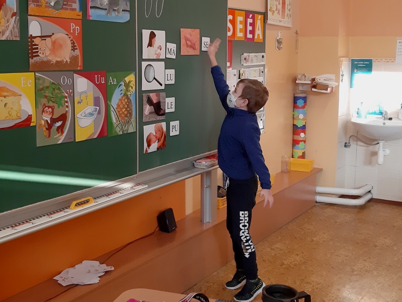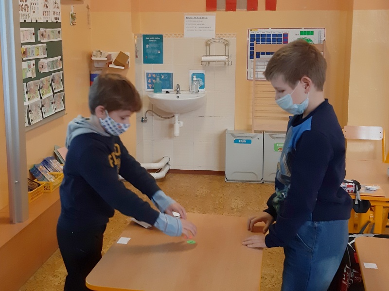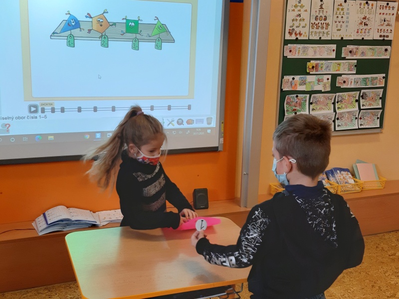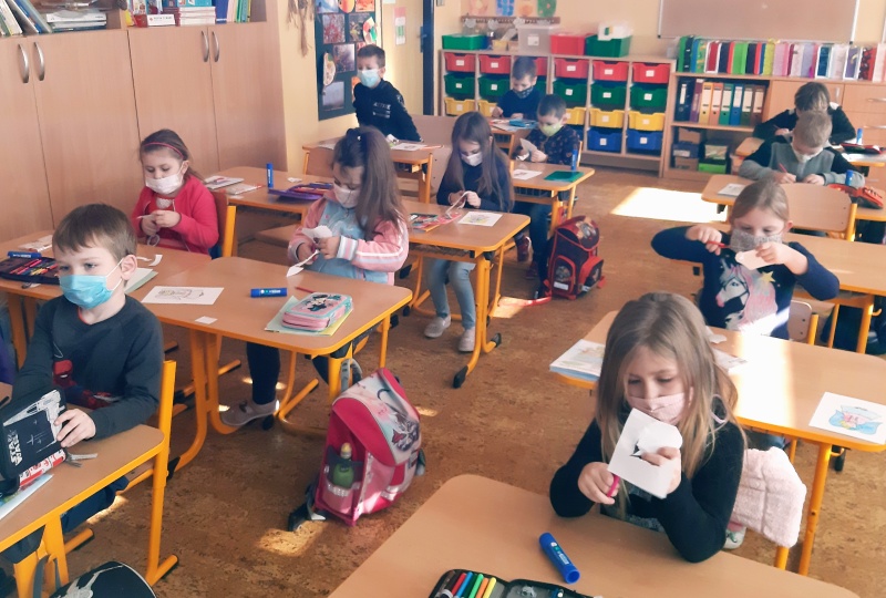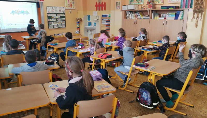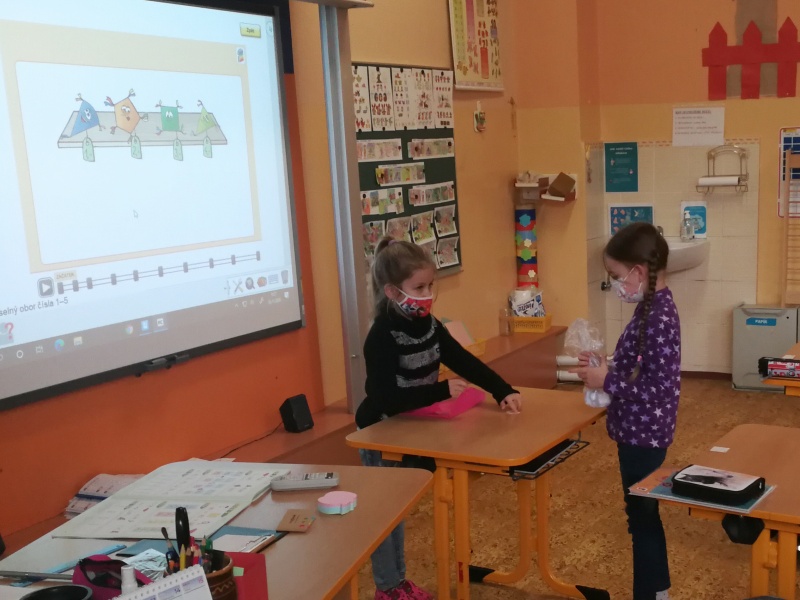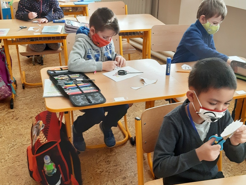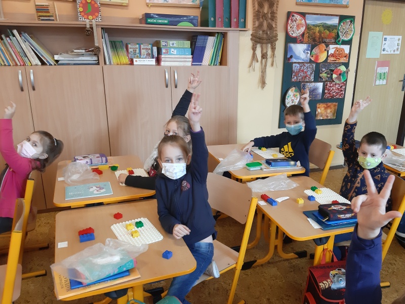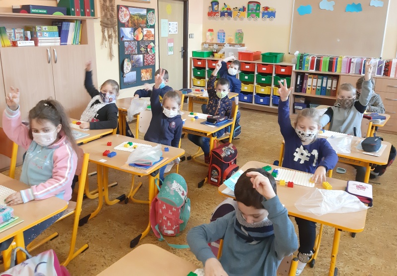 První týden trávili na svém patře sami a docela si přivykli na přísná opatření. Je to skoro stejné jako na jaře. Roušky celý den, časté větrání, dezinfekce, stálé umývání rukou, výměna roušek. Už nám to nepřijde. Učíme se jako jindy, ovšem tělocvik všem chybí. Prvňáci si rádi hrají na obchod a také s kostkami Lega se jim matematika učí snadno. Ve výtvarné výchově dohání malování barvami a vyrobili si i pěkné čertíky.
