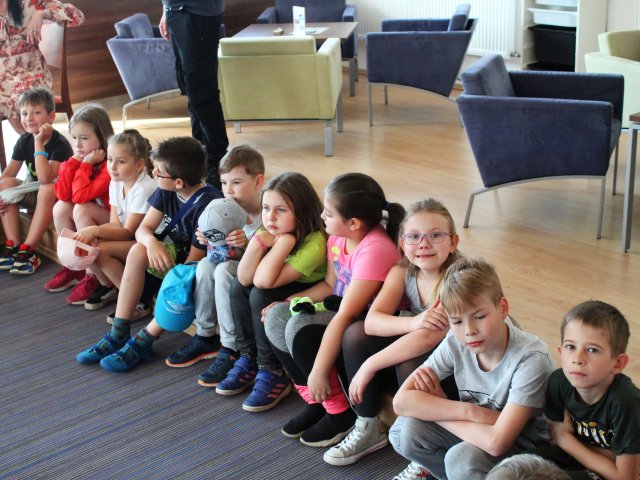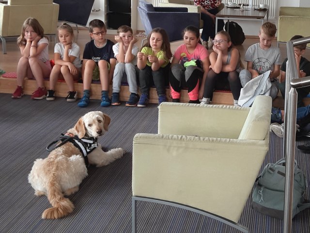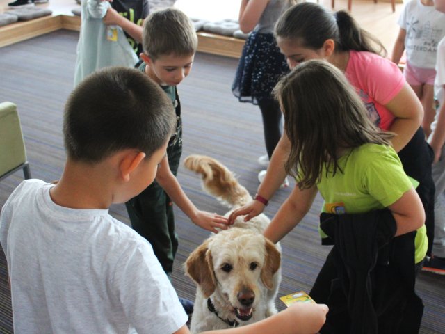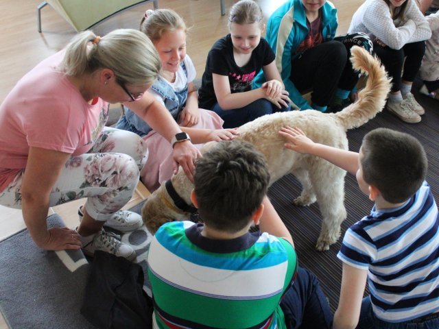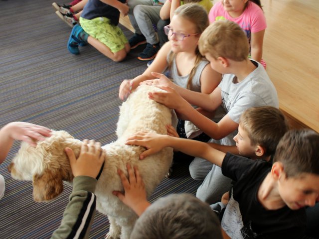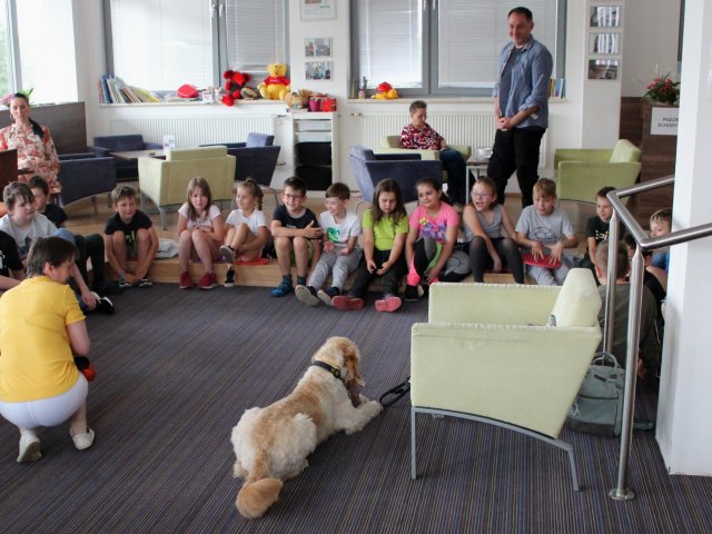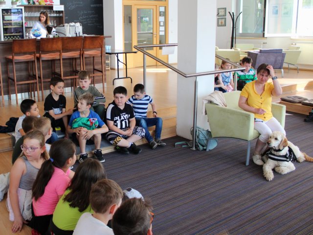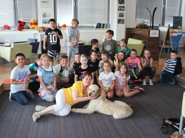 V literárním salonu Regionální knihovny Karviná nás čekalo v pátek 20. května překvapení. Uprostřed salonku seděla zvláštní besedující s krásnou jemnou béžovou srstí. Místo pozdravu jen spokojeně vrtěla ocáskem. Všechny děti se okouzleně dívaly na krásného vodicího pejska jménem Dixie. Její panička paní spisovatelka Anna Burdová nám svou čtyřnohou pomocnici předvedla, co všechno umí a pověděla dětem mnoho nového o vodicích psech. Také nám věnovala svou knihu do školní knihovny. Zajímavými dotazy ke konci besedy překvapil náš žáček druhák Kuba. Samozřejmě si děti Dixie pohladily a přesvědčily se, jak je poslušná. Možná více než někteří žáci. Nakonec jsme dostali všichni malé občerstvení, aby se nám lépe šlapalo zpět do školy.