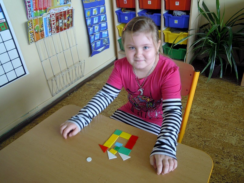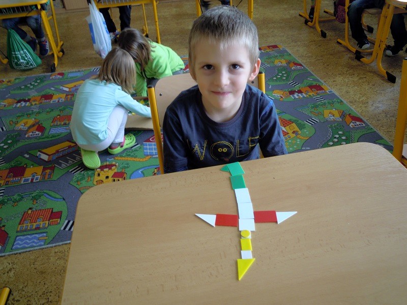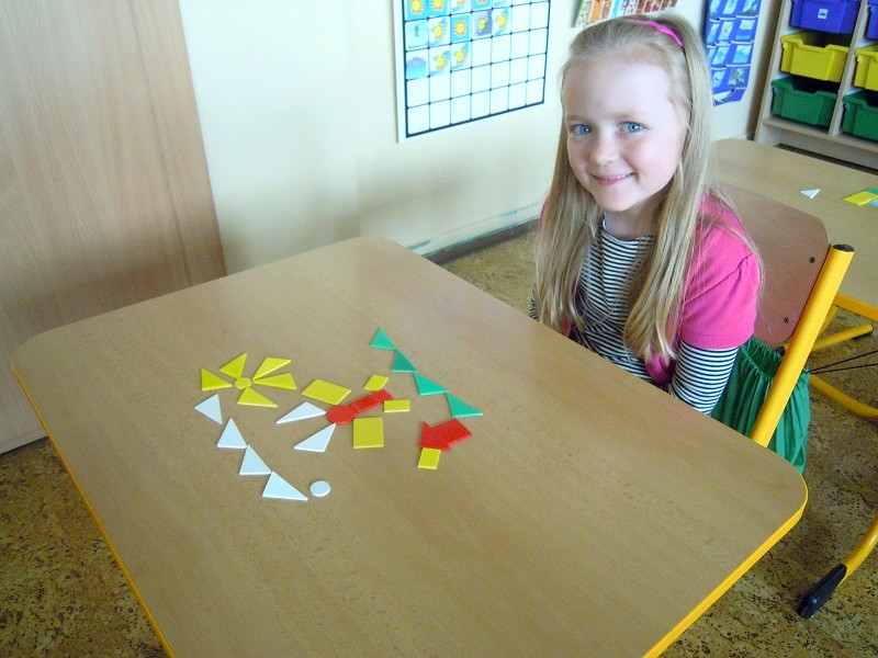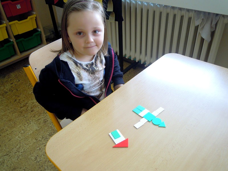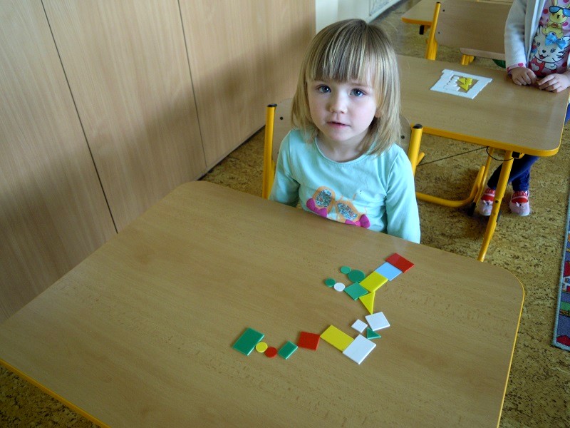 Tématem dnešního setkání byly geometrické tvary, které předškoláci již dobře znají ze školky, tak jsme si je pouze zopakovali na kouzelné tabuli přiřazováním obrázků. Poté následoval pracovní list plný kruhů, čtverečků, obdélníků a trojúhelníků, k tomu také trochu vybarvování, třídění barev a na závěr skládáním obrázků z plastových maket.