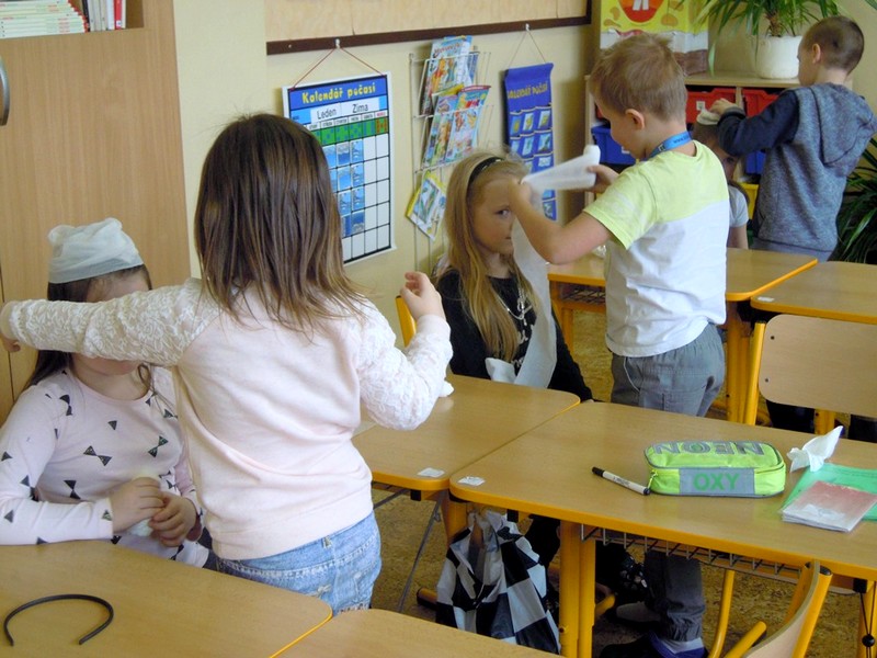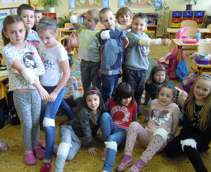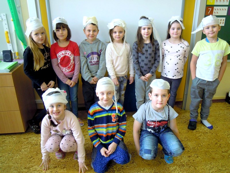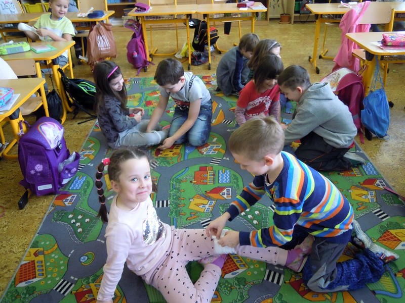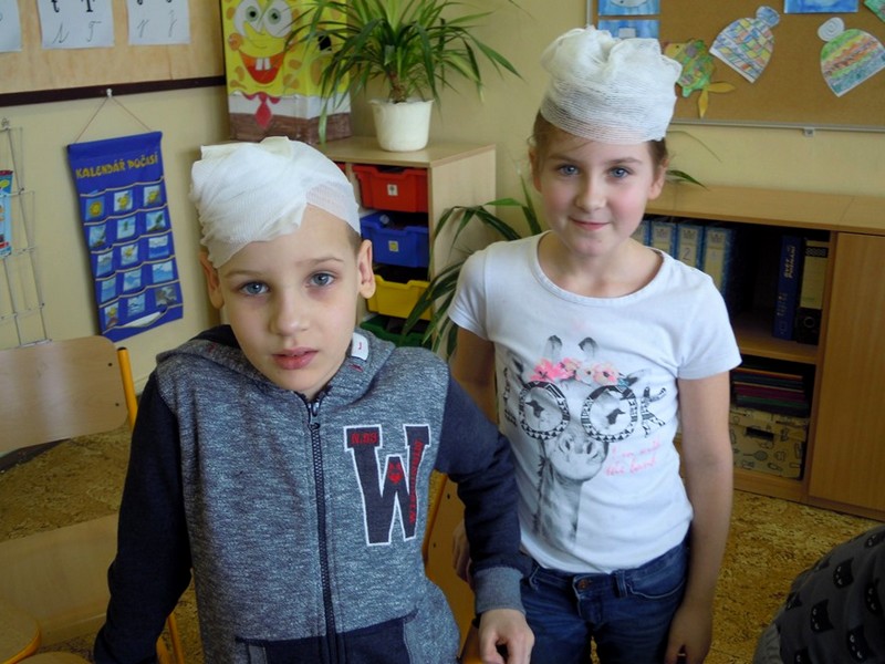 Prvňáci si chtějí vše vyzkoušet. V prvouce se učí o úrazech a jejich ošetření a hned následuje praktická ukázka. Malí doktoři se učí jednoduše obvázat svého "raněného" spolužáka či spolužačku. Pod obvazy mizí hlavy, kolena i ruce. Žáci vypadají jako v polním lazaretu, s tím rozdílem, že obvázaní prvňáci se smějí. Vše je jenom jako. Ještě si zopakovat důležité předcházení úrazů, jak přivolat pomoc a ošetřovatelský kurz se zvoněním končí.
