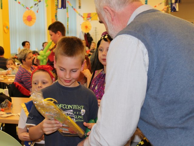 Tančilo se také i s rodiči, soutěžilo dokonce ekologicky - sbíráním vršků z pet lahví. Nikdo neprohrál, vyhráli všichni sladkou odměnu. Jízda na dřevěném koníkovi mezi balónky byla snadná a nakonec oblíbené talíře na tyči. V této disciplíně jsou někteří už mistry. Při závěrečném hadu z masek měl Hopsalín pomocníka rybku Nemo. Konečně napínavé losování tomboly a předávání dárečků z rukou pana ředitele. Na koho nevyšlo, mohl si koupit kočičí štěstí. Rodiče mohli pozorovat své tančící a hopsající děti nad kávičkou, zákuskem či chlebíčkem z našeho tradičního bufetu.