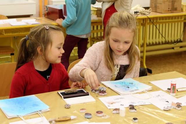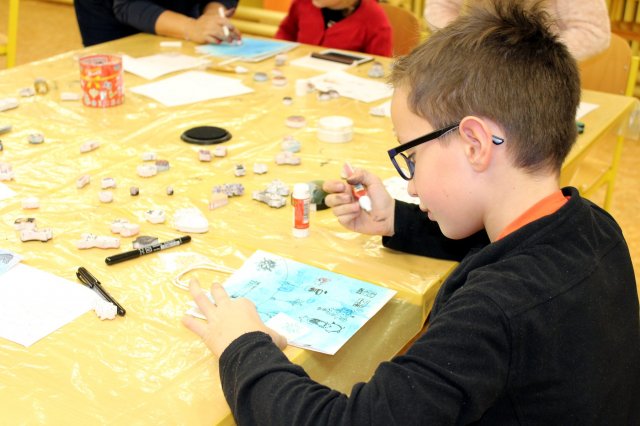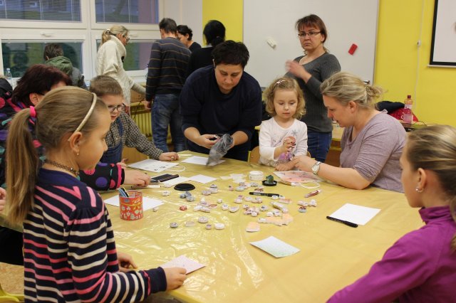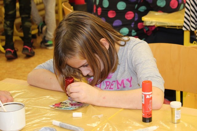 Výtvarná učebna byla proměněna v dílnu přímo tvořivou. Děti si zde mohly nazdobit vánoční přáníčka i dárkové tašky. Provázely je další ochotné a zručné maminky, paní Trojáková, paní Rumpelová a paní Mazalová, kterým asistovaly naše dvě paní asistentky.