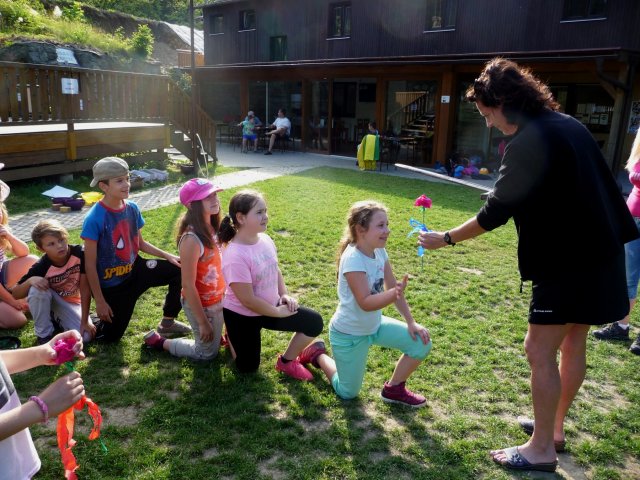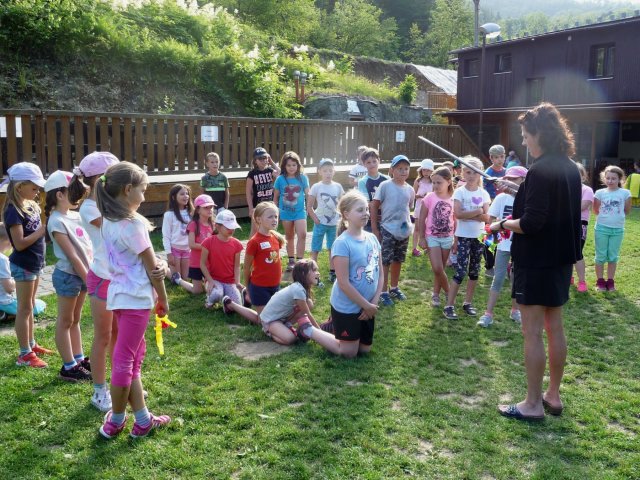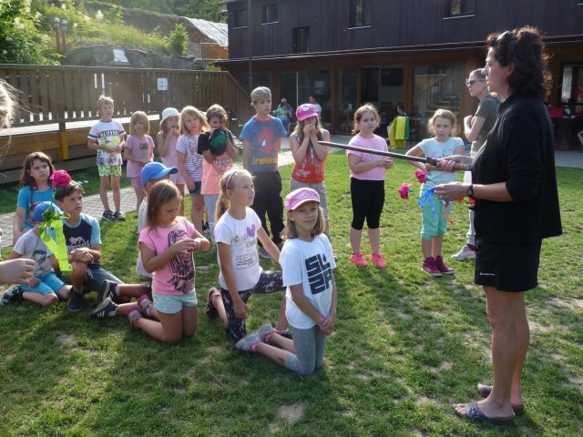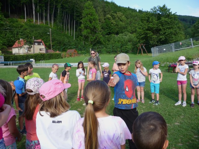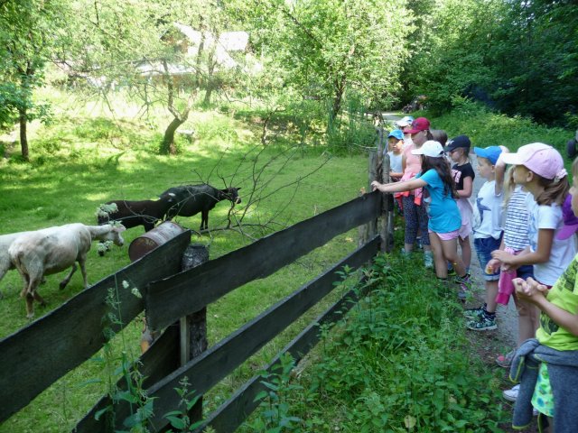 Pozorovali jsme ovce, kozy, psy i kočky. Určujeme květiny, stromy. A hlavně dýcháme zdravý horský vzduch prosycený lipovými květy. Odpoledne taky vycházíme mimo areál do lesa. Jsme v obci Komorní Lhotka a její střed s povinnými nákupy jsme navštívili také. Děti opravdu rády nakupují. Odpolední hry a soutěže Malého prince baví všechny. Opekli jsme si v podvečer párky a sledovali jaký talent mají někteří naši spolužáci. Všichni se výborně bavili a děti předvedly zajímavá taneční, artistická, gymnastická, pěvecká vystoupení.