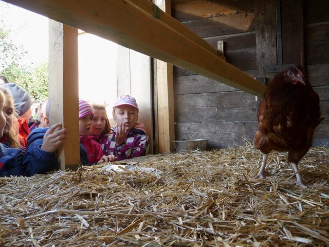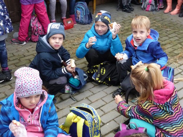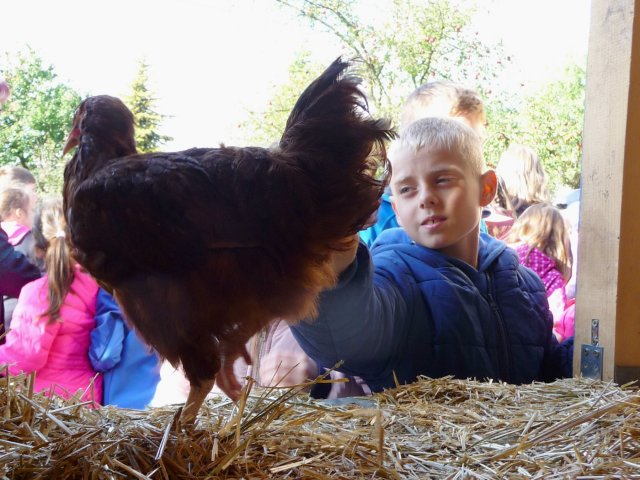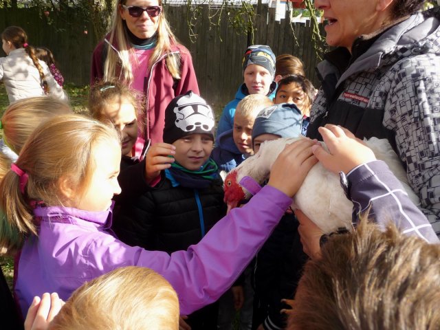 Kam? Na kozí farmu do Havířova. Slepice, husu, kachny, kohouta i kachňata si mohli žáci čtvrťáci a druháci pohladit, dokonce sáhnout i do zobáku. Kde se to někomu naskytne! Největší atrakcí bylo přivolání stáda koz a kůzlat. Kozy bílé byly přítulné, zvědavé, slušné - neloudily po dětech pamlsky. Dokonce si nechaly sáhnout na své rohy, i když to prý koza nemá příliš v oblibě. Pro zvířata jsme přinesli dárky v podobě suchého pečiva, několika jablíček i mrkví. Vždyť zvířátka měla přece svátek!