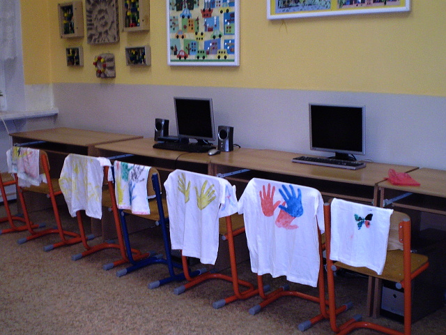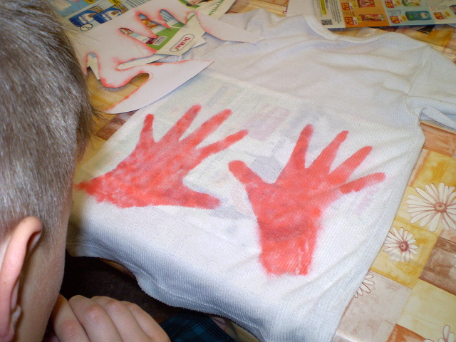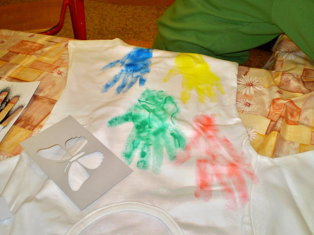 V první části programu připraveného pro děti, bylo tvoření obrázků na bílá trička. Základem byla výroba vhodné šablony, kterou se nakonec staly pravá a levá ruka každého dítěte. Ze začátku se na tričku objevily jen ruce, ale na konci práce byla trička ozdobená celá a velice barevná. Dětem se foukání pomocí speciálních fixů velice líbilo.
