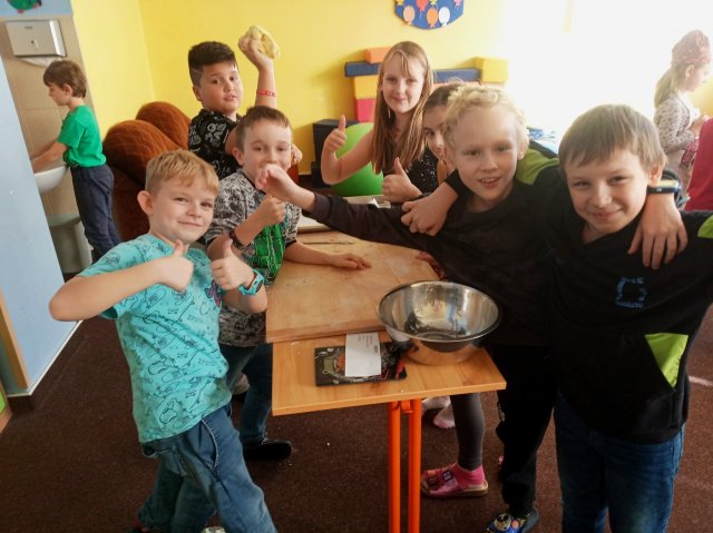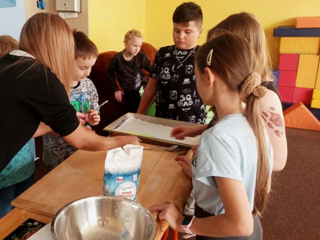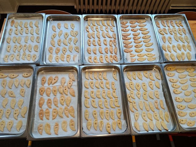 Děti byly rozděleny do čtyř skupin, ve kterých si zvolily svého ,,chefcukráře" a následně si každý tým odvážil, uhňatal, vyválel, vykrojil a upravil své duchy. Každá skupina pracovala týmově, každý zastával jinou funkci, kterou si děti navzájem přidělily, což opět ukázalo, že umí pracovat v týmu a navzájem si pomáhají. Finálně jsme zaplnili 10 velkých plechů, které jsme dali péct do naší školní kuchyně.